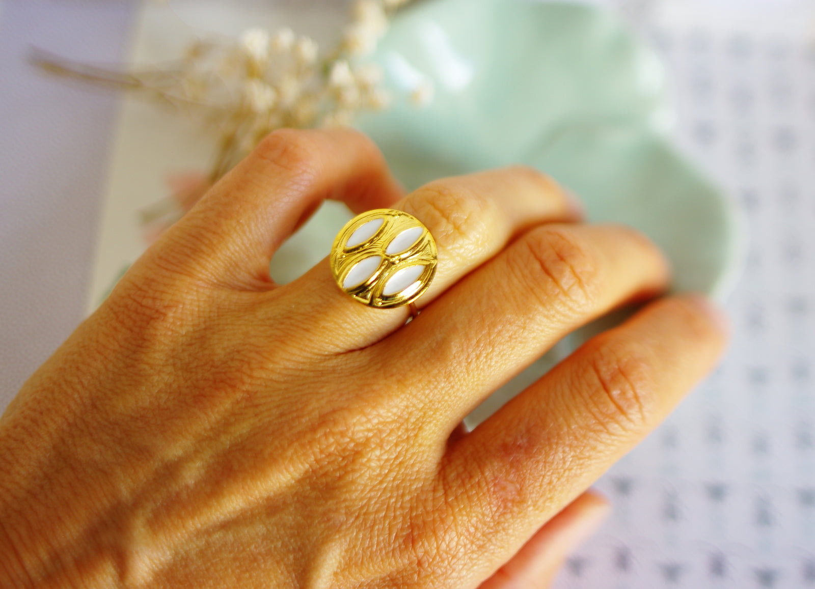 bague Louisa, émaillage à froid blanc, la bague est réglable, conviendra à une taille 52 à 55 FR. Diamètre 2 cm. Métal doré à l'or (0,1 micron) sans risque d'allergie.