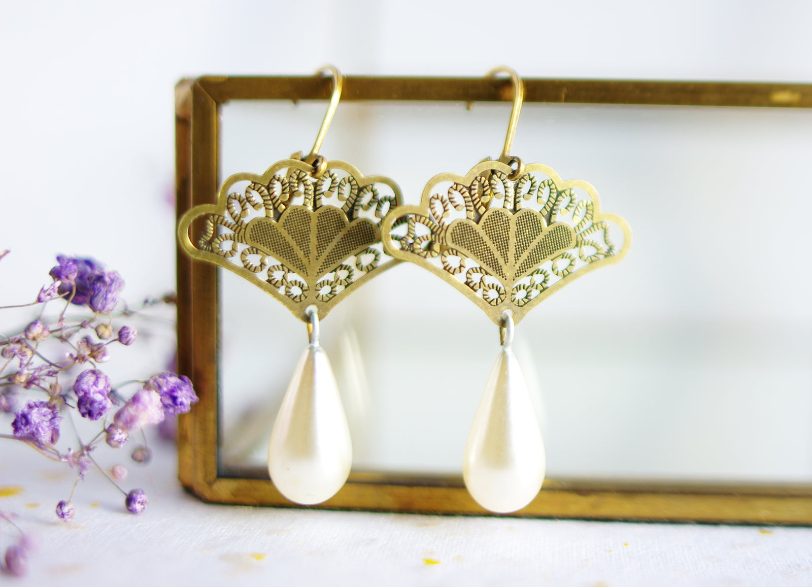 boucles d'oreilles eventail upcycling style art déco, métal bronze effet or vieilli, pierres gouttes en verre couleur cognac ou bleu réalisation artisanale des années 70. Longueur 4 cm. Motif 20x15 mm.
