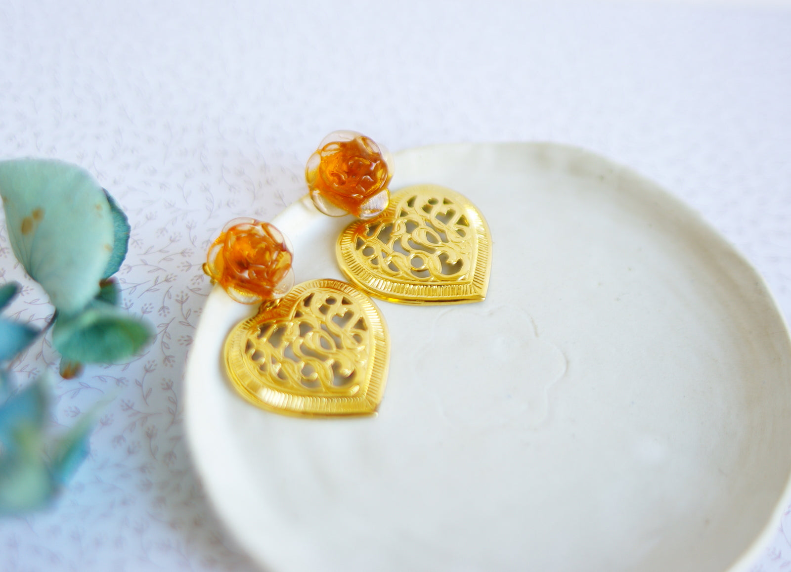 Les boucles d’oreilles Romance combinent élégance et artisanat. Chaque cabochon en verre est minutieusement monté sur un cœur ajouré en métal, le tout en laiton plaqué or fabriqué en France. La soudure est réalisée à la main par mes soins, garantissant un bijou unique et durable.