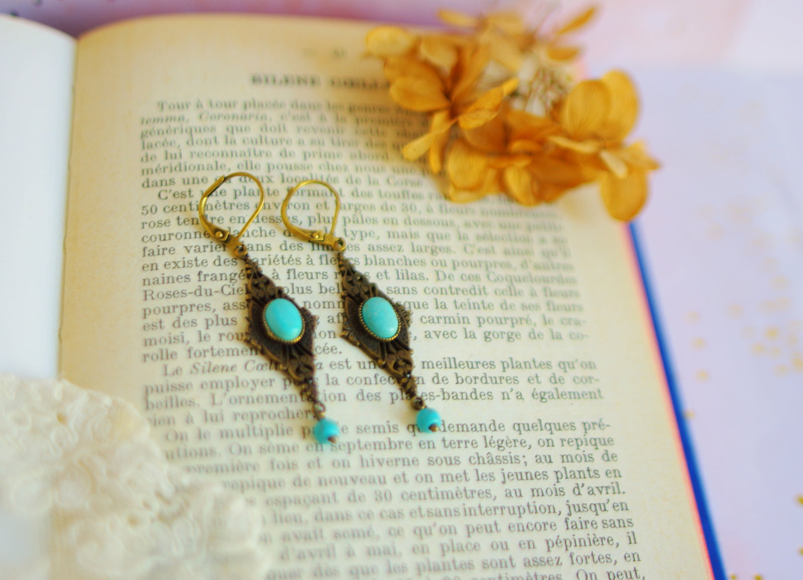boucles d'oreilles Suzon style art déco, longueur 5 cm, motifs 15x35 mm, pierres agates verte ou nacre ou turquoise. Métal laiton plaqué bronze sans chrome sans nickel.