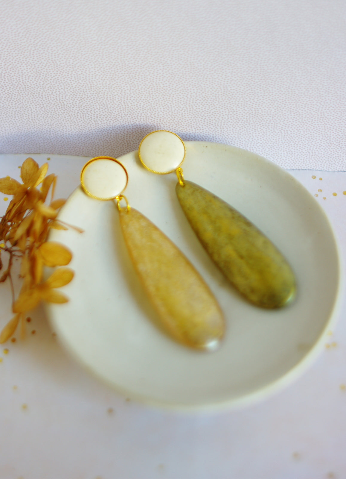 boucles d'oreilles Vertigo, perle en résine vintage et cabochon en verre vintage, longueur 8 cm. Métal laiton doré (0.1 micron) sans chrome sans nickel.