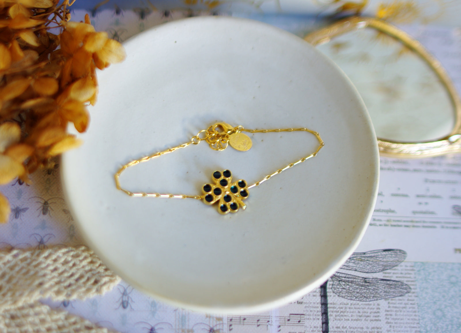 bracelet porte bonheur, motif 15 mm, longueur du bracelet 14,5 cm avec chainette de rallonge de 3 cm, émaillage à froid vert. Métal laiton doré (0.1 micron) sans chrome sans nickel.